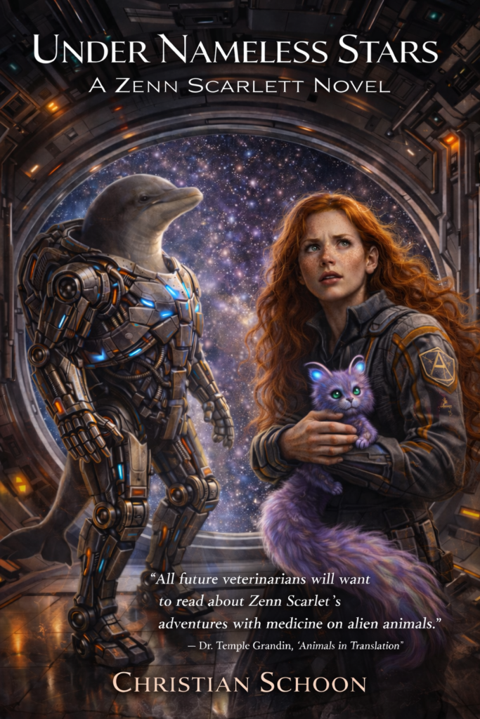 And (synchronicity!) when I dropped by Powell’s online, I was greeted by a friendly review of my first Zenn Scarlett novel. “The story is full of intriguing alien species, and their ailments. Add to that, some cool vet tech, and you have a bio nerd fest in the making. I also enjoyed the mystery of the various ‘accidents’ involving the beasties. townies push hard from every direction to shut down the Cloister, not renew their lease, and use the land for agricultural purposes. Indeed, Christian Schoon is an author to keep an eye on…” Awwww. Isn’t that kind?